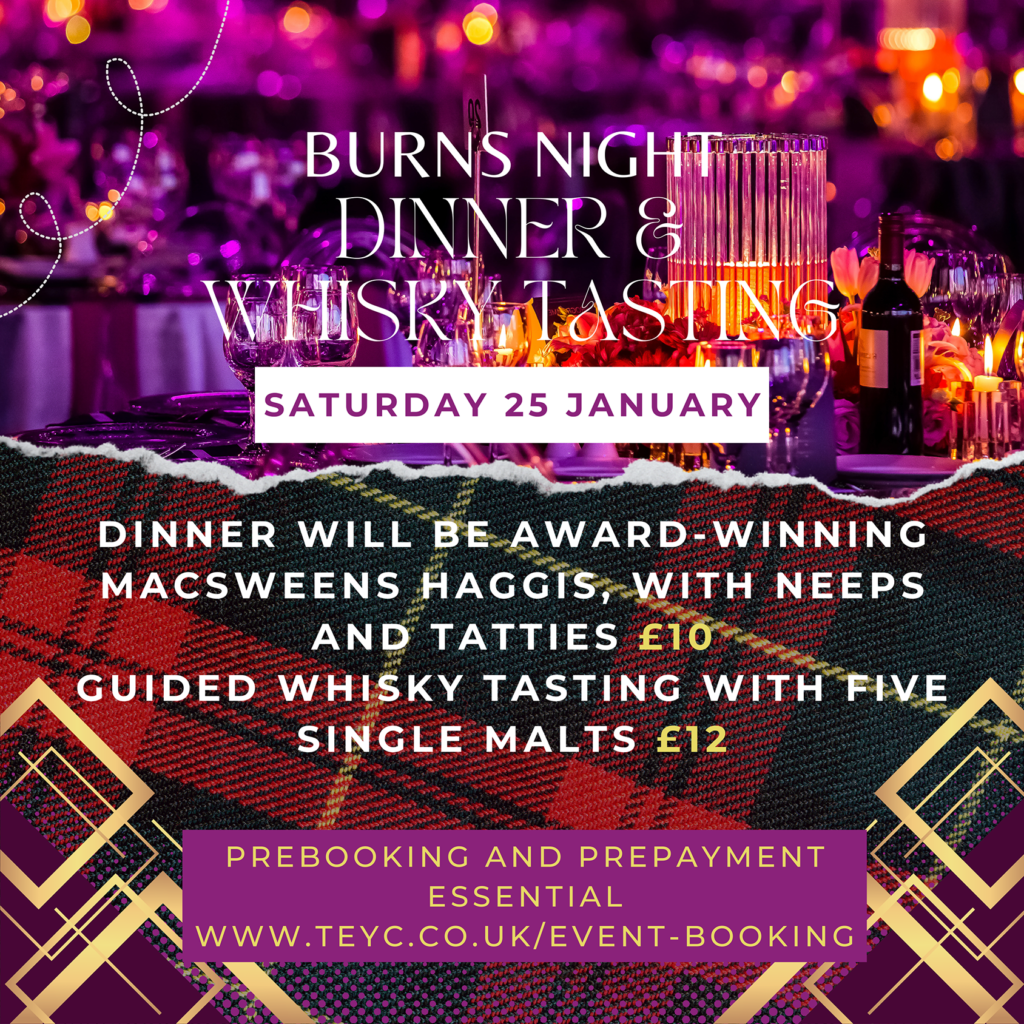 TEYC is hosting its annual Burns Night Supper on Saturday 25 January. This year, we are adding an optional guided whisky tasting of five single malts, so do come and join us again.