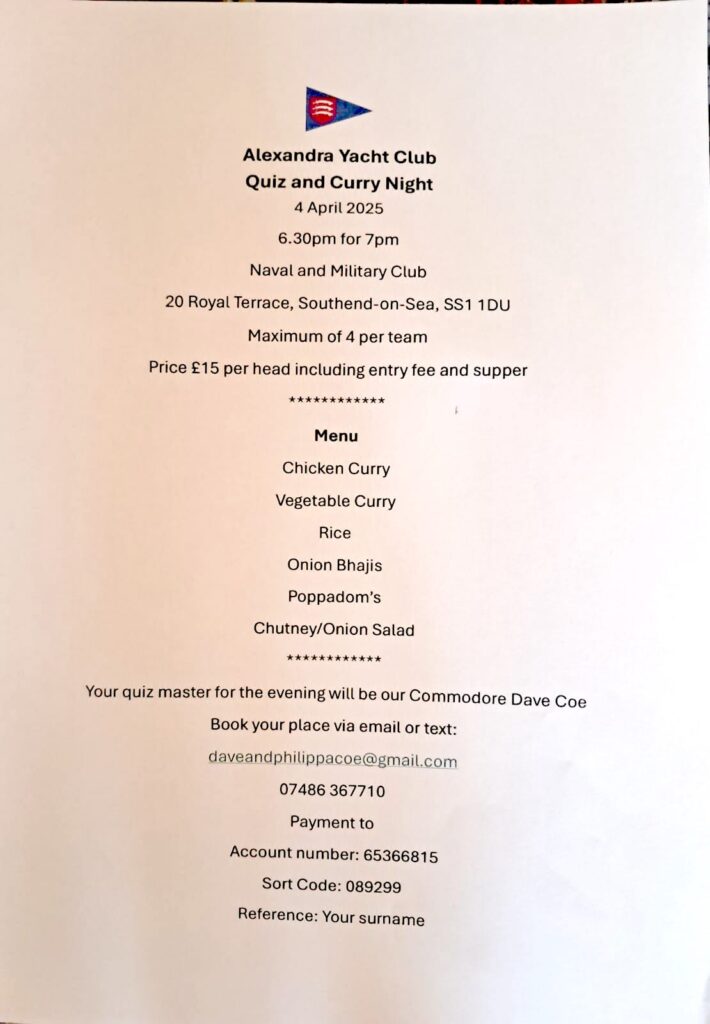 AYC are hosting a quiz and curry evening at the Naval and Military club and they have extended an invitation to TEYC members.