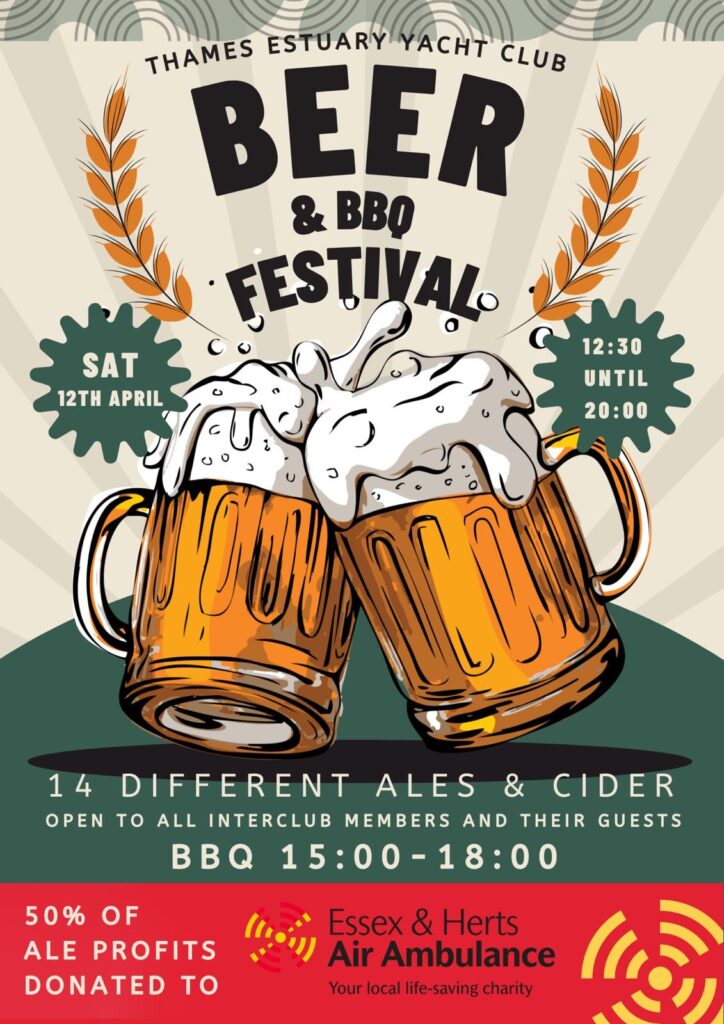 Come along and sample from a choice of 14 great local ales and cider and a sizzling BBQ in the company of other members and Interclub sailors in our amazing waterside clubhouse all whilst raising funds for Essex Air Ambulance.