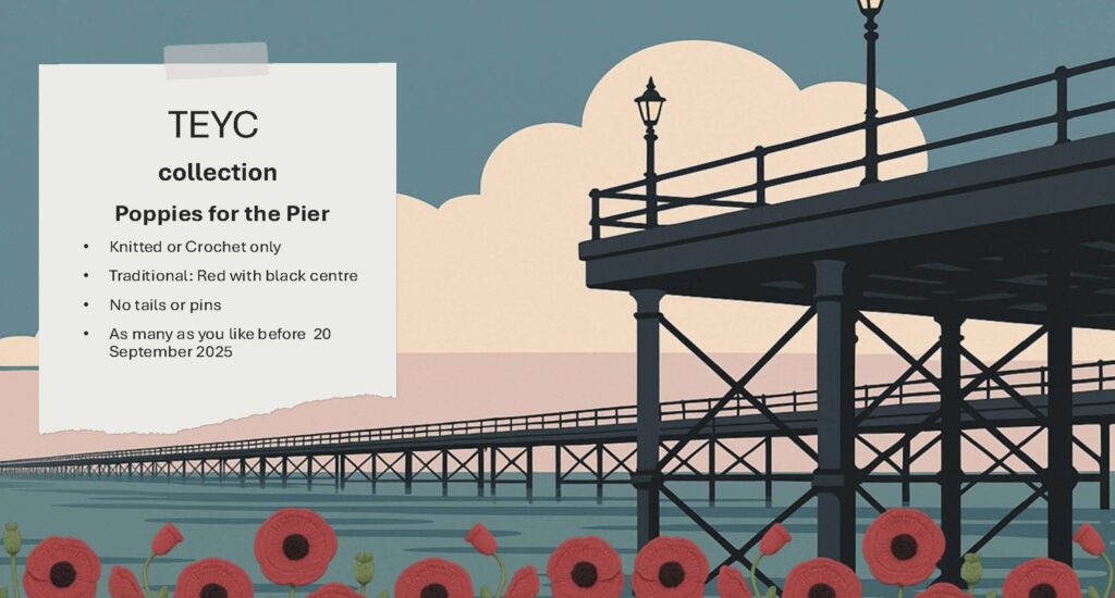 This sounds like a great project so please help TEYC contribute a whole dingy full of poppies! There will be a collection point at the club so please get your yarn, needles and hooks out, come down knit/crochet and natter at the bar or just drop a poppy (or 10) in when you are passing. We’ll take all the poppies collected to the Pier no later than 20 September for inclusion in the display.